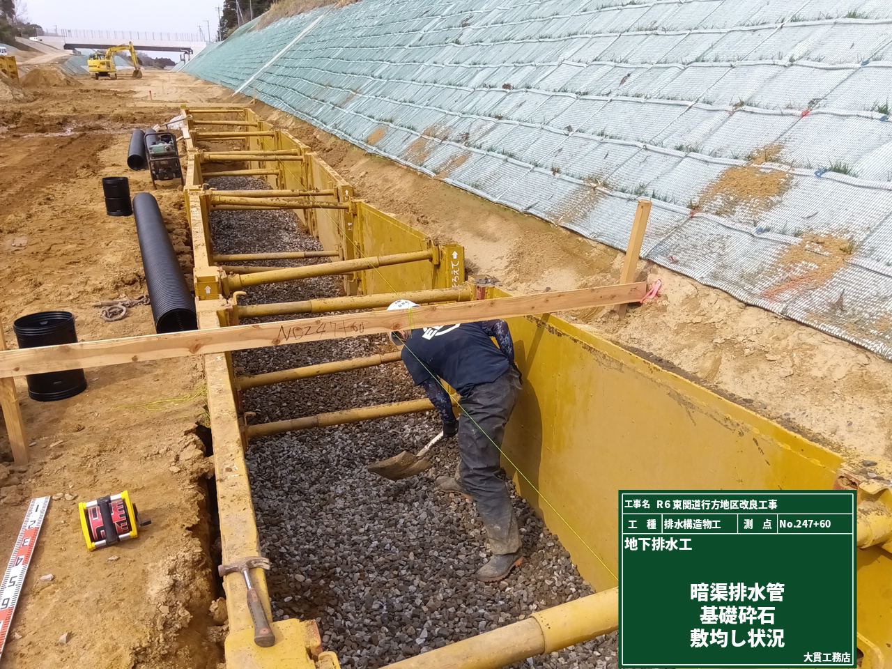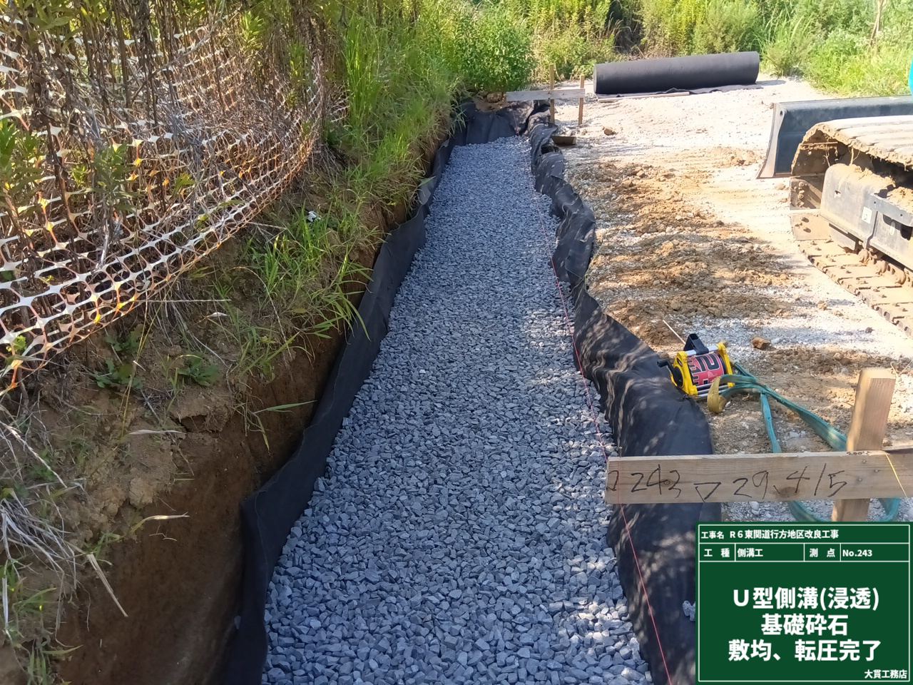 砕石を敷均し・転圧 → 透水シートを設置 → その上に再び砕石を敷均し・転圧。