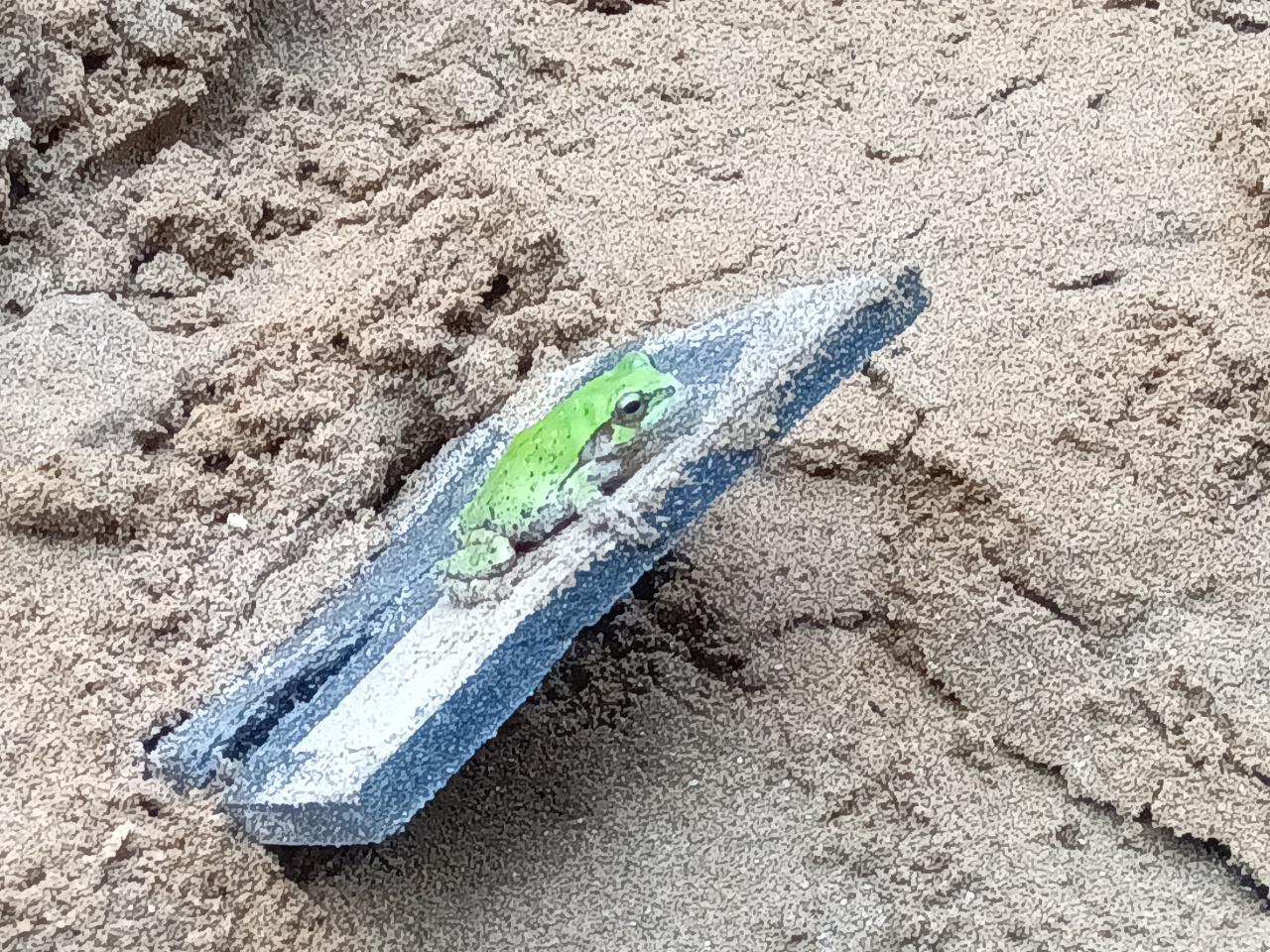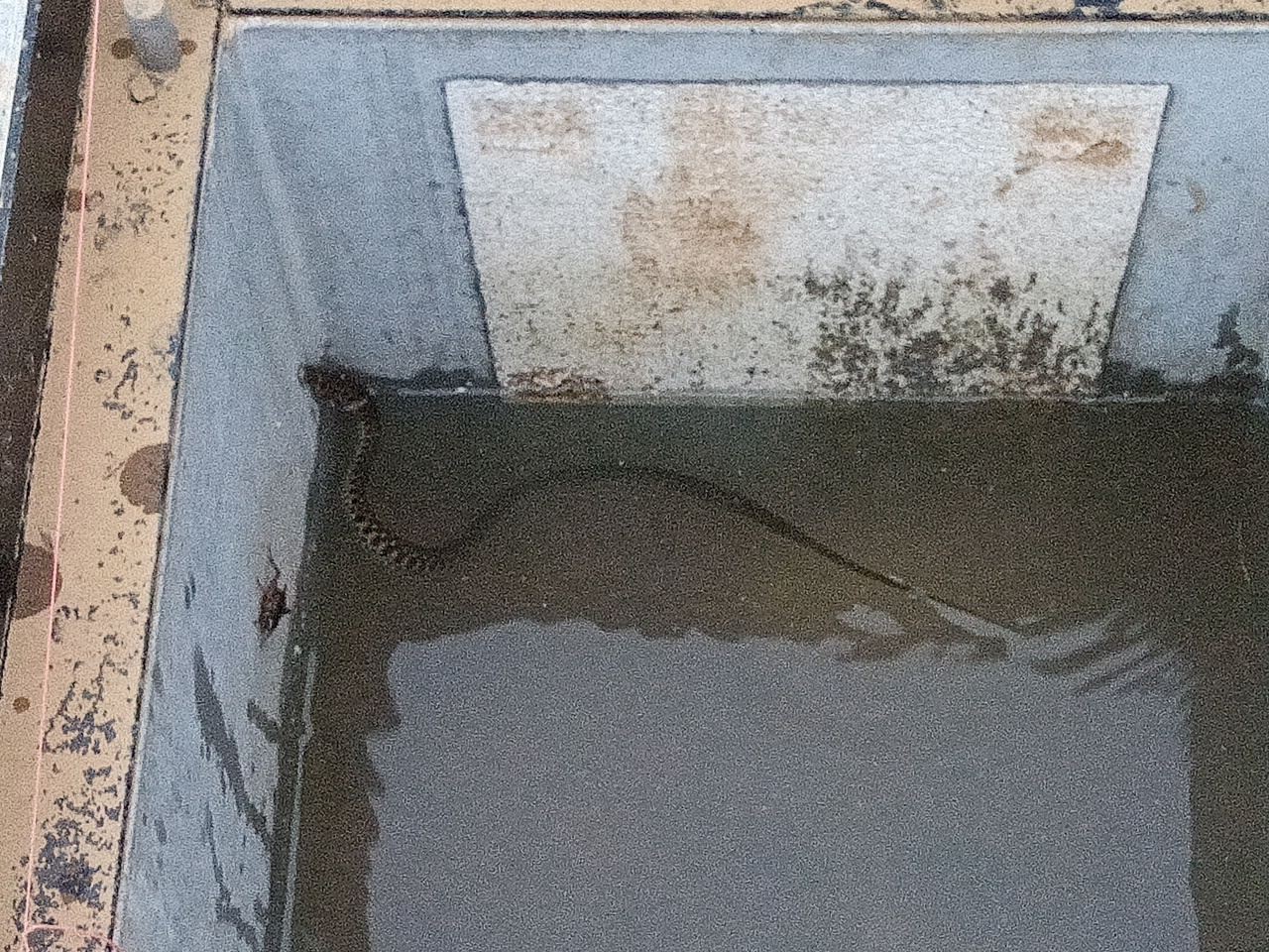 なんと 集水桝の中に蛇とカエルが同居生活しているのが発見されました。