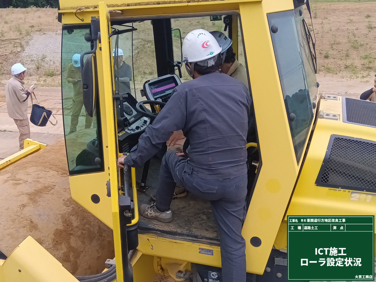 その際に確認・把握した、まき出し厚や締固め回数などの最適な施工条件をローラなどのICT機械に設定していきます。