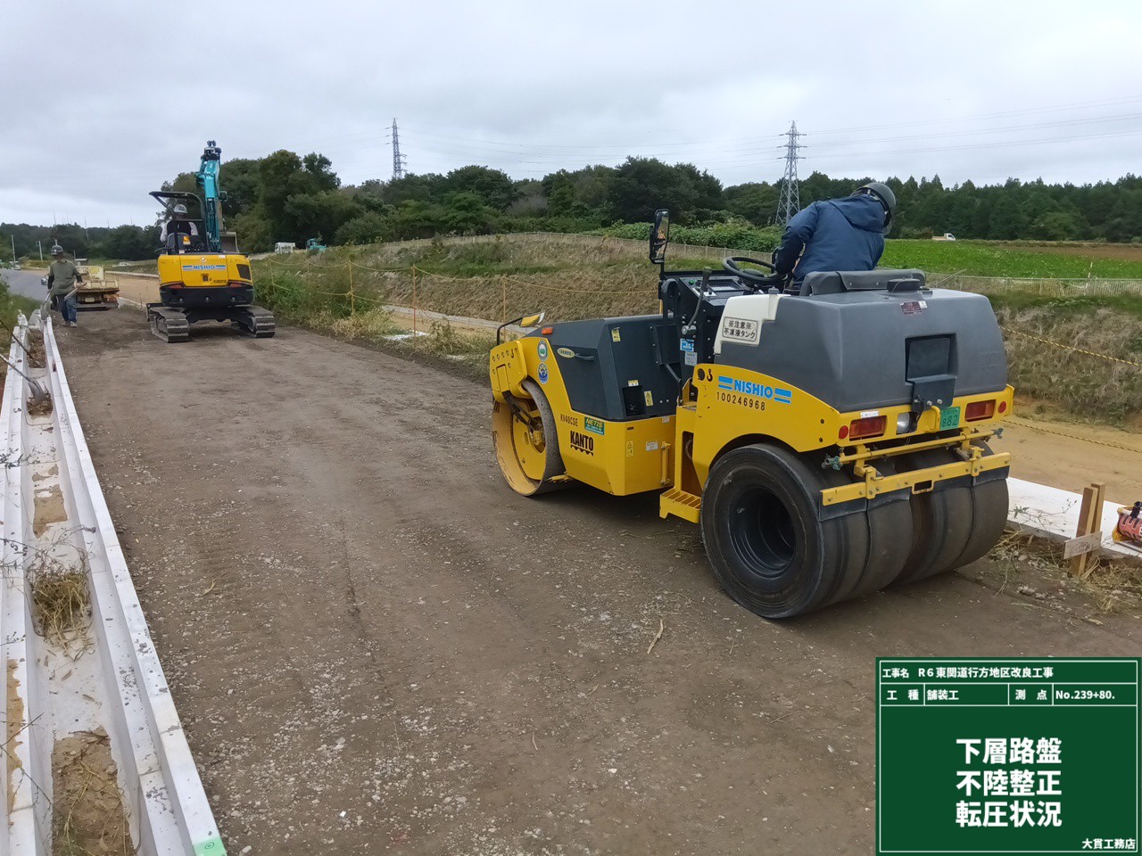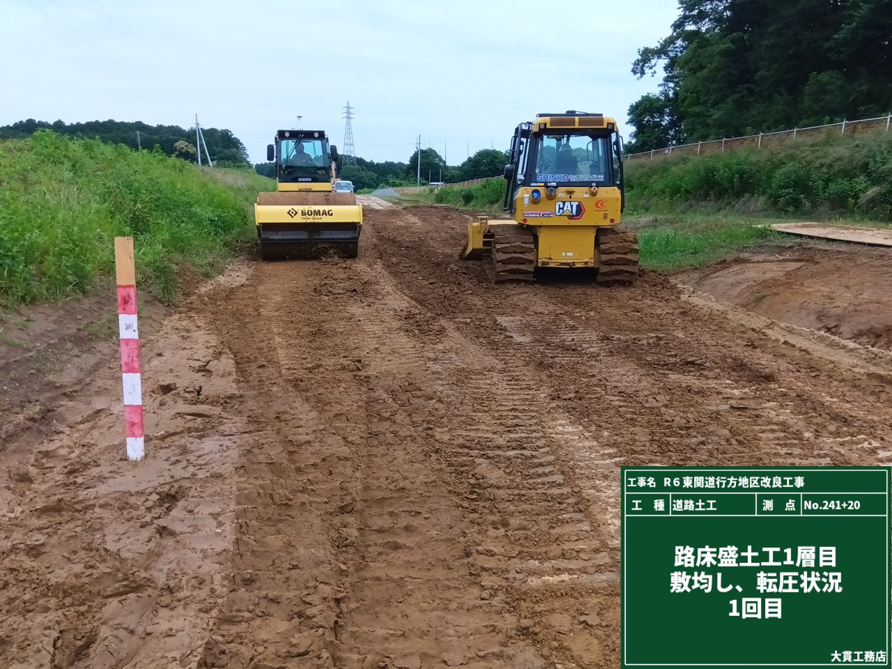 ブルドーザーで平坦に敷き均し、ロードローラでしっかり締固め。