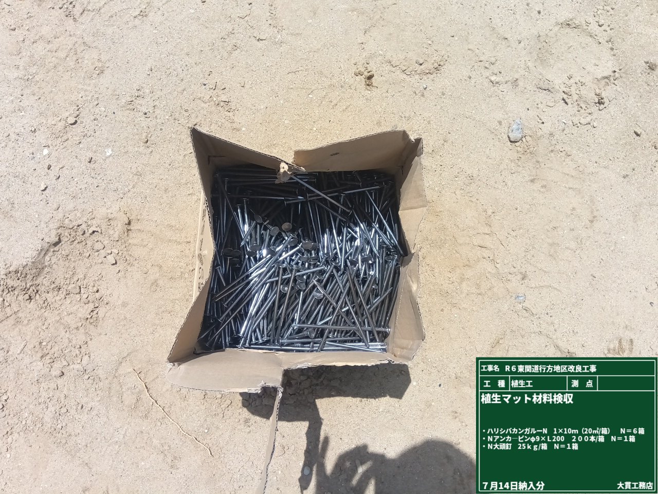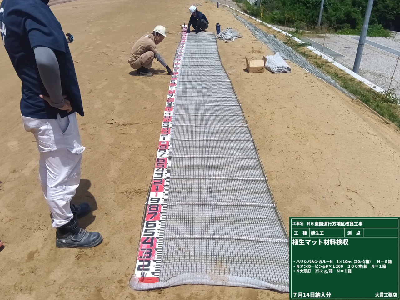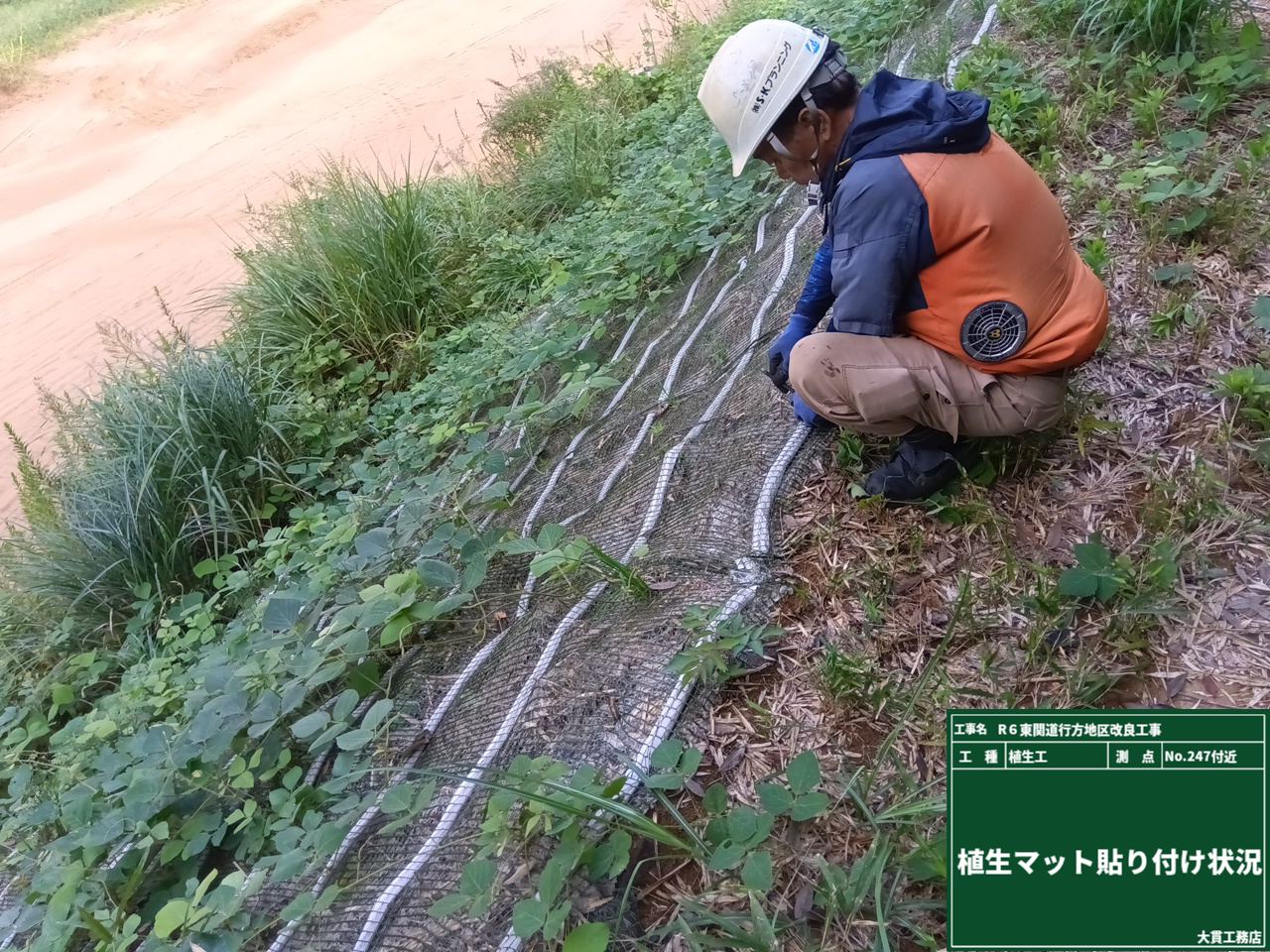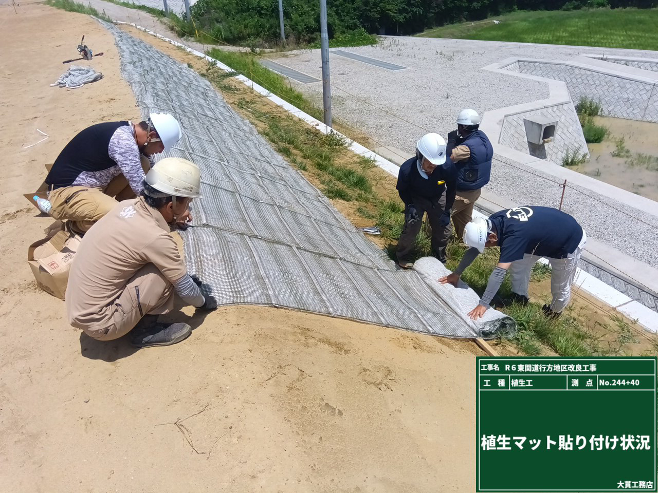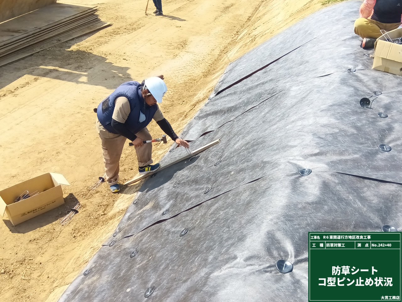 こちらは 植生マットの張り付け、そして U型側溝の敷設作業。