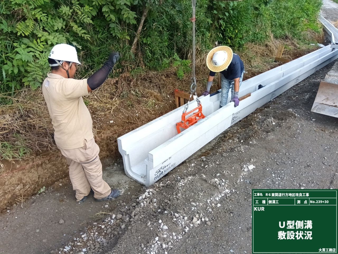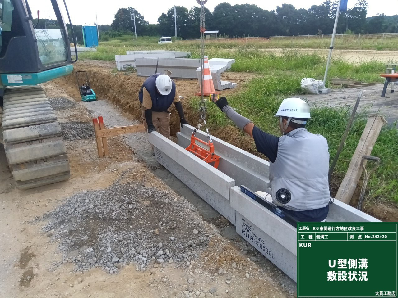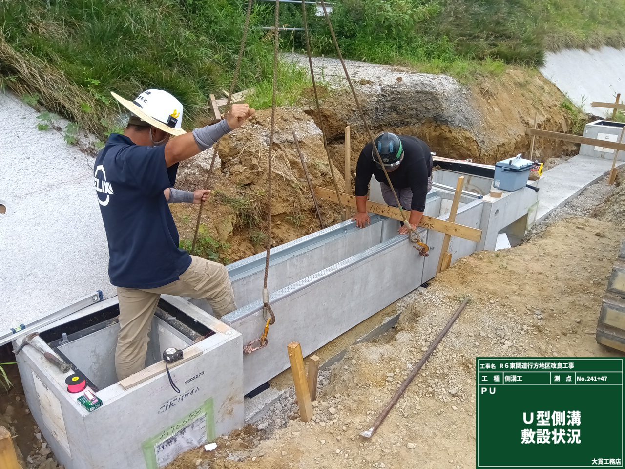 上段と下段、どちらもU型側溝を敷設している写真ですが、工程が違いますね!