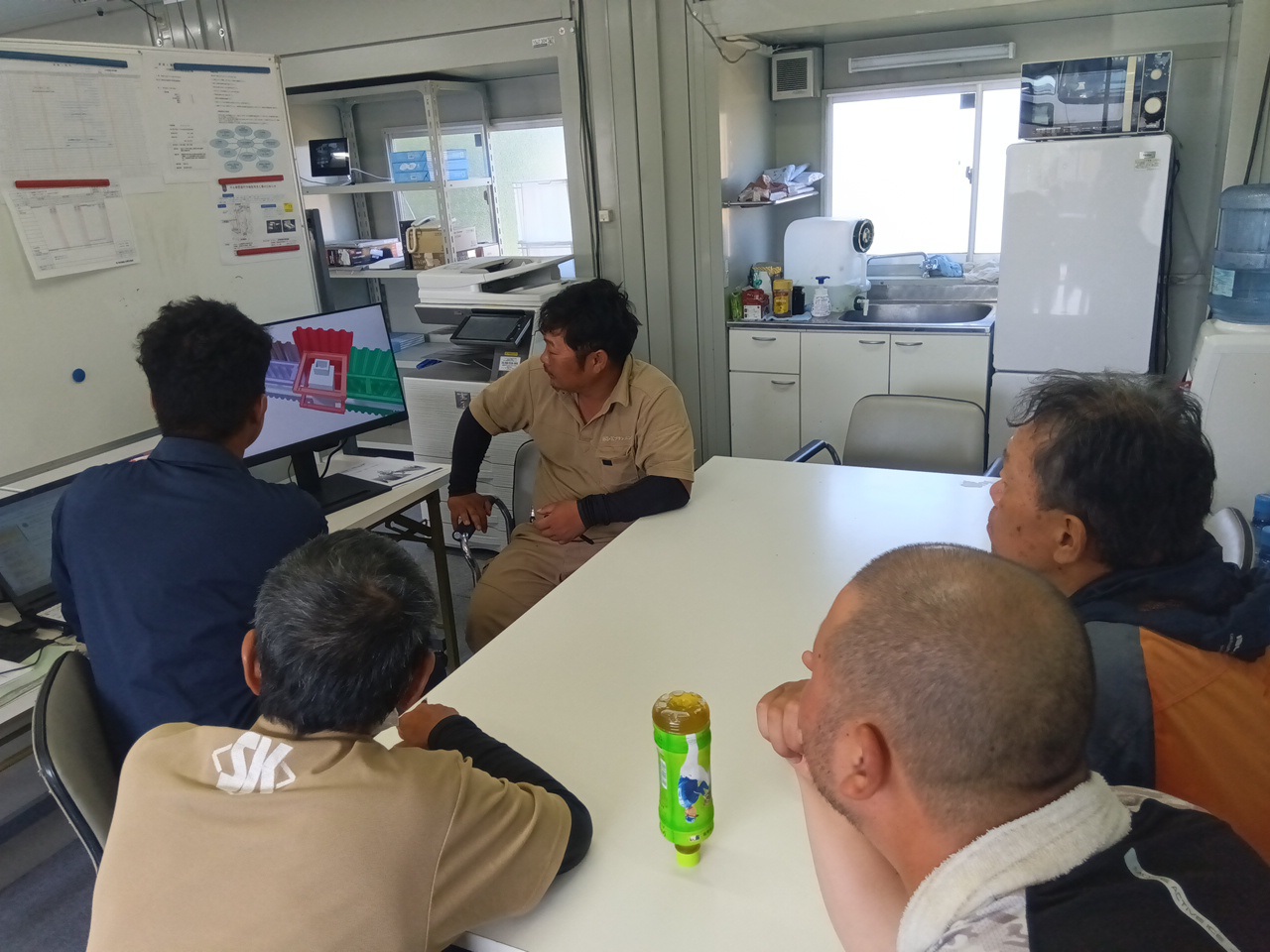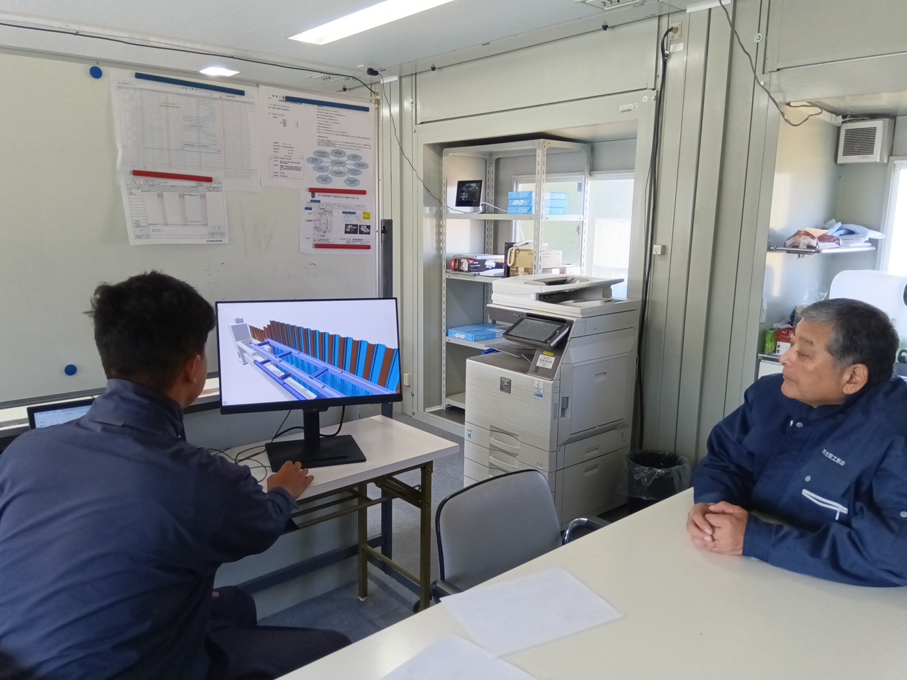事務所では、側溝工の3Dデータを見ながら施工箇所、施工状況を確認しています。