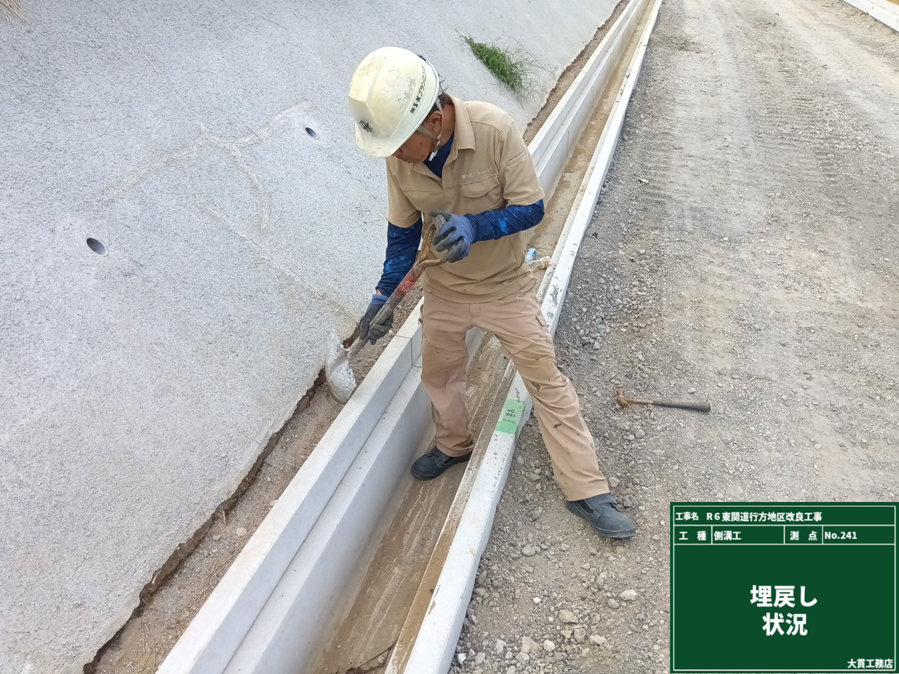 U型側溝を敷均した後は、壁との間を埋めていきます。