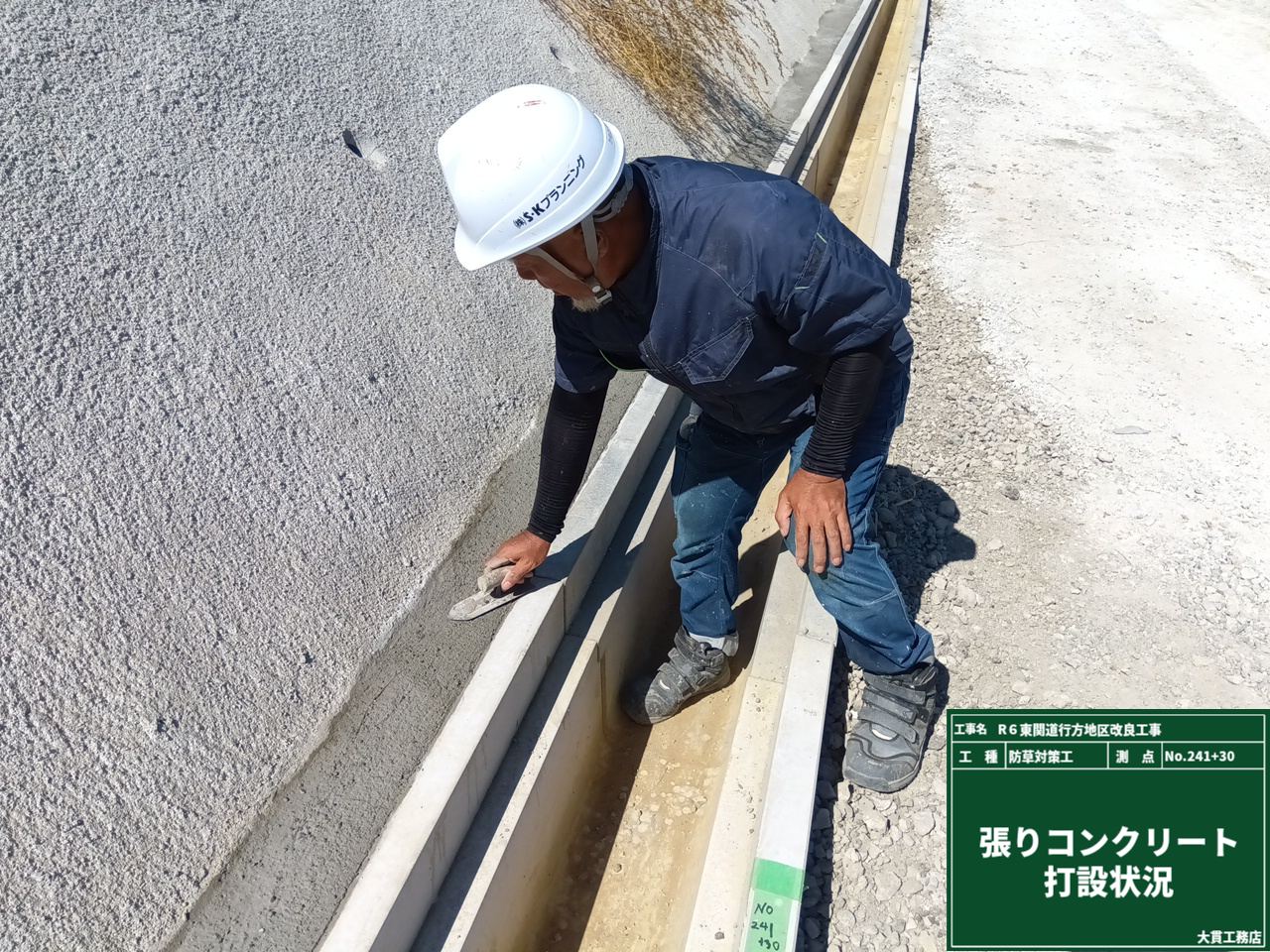打設後、敷モルタルで接地面を調整しながら、プレキャストU型側溝を設置します(写真右2枚目)
